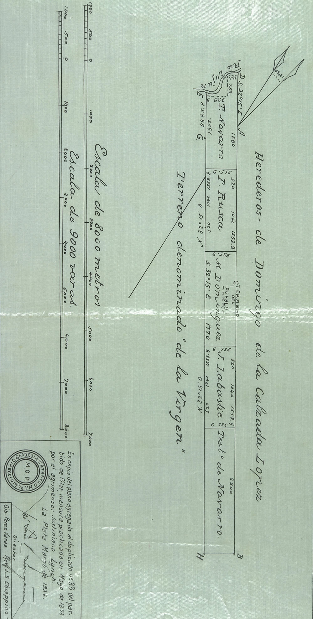 Plano 33 del Agr. J.Lynch; 1873. Tierras de Teodoro Navarro, Francisco Rusca, M.Dominguez, J.Labastie y otros, en la misma franja que conforma el eje del pueblo de Pilar.