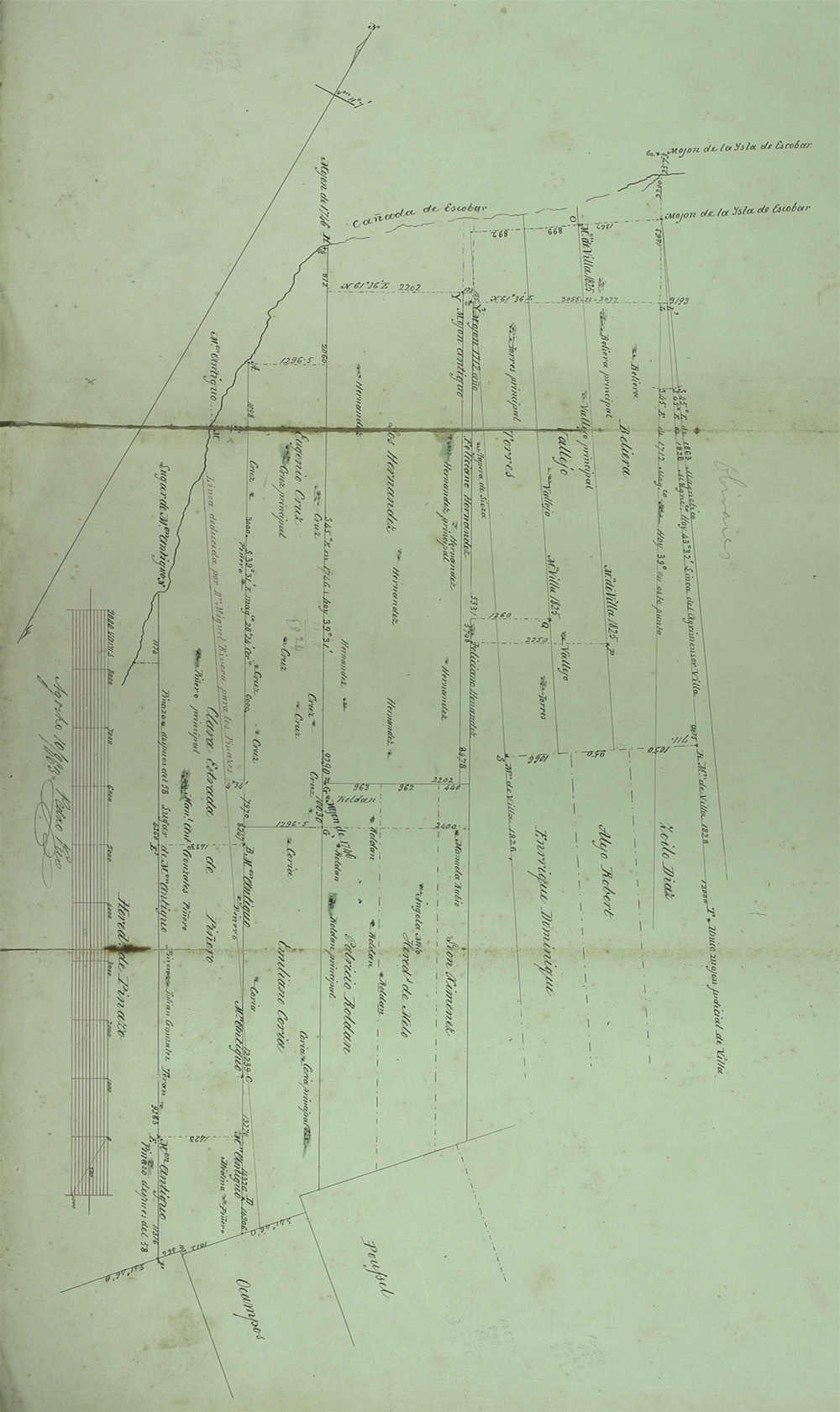 Plano 55 del Agr. Pedro Pico; 1863. Reconocimiento de tierras al SE de la cañada de Escobar. Tierras de Piñero, Pinazo, Cruz, los Hernández, Torres, Vallejo, Beliera y otros.