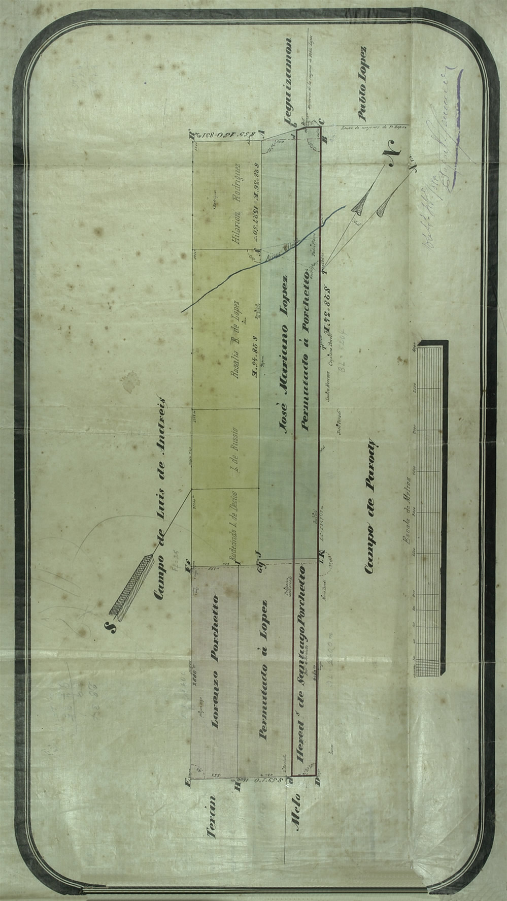 Plano 64 del Agr. Rafael Hernández; 1878. Tierras de Mariano López y Santiago Porchetto.